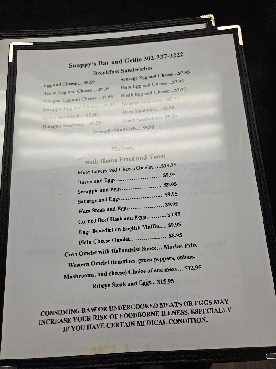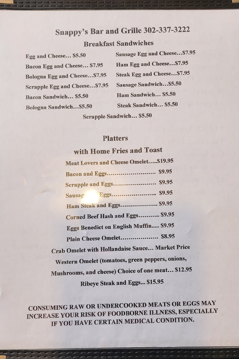 At Snappy's Bar & Grille, we invite you to indulge in a menu brimming with mouthwatering delights and homestyle favorites—perfectly crafted to satisfy every craving! Located at 7511 Federalsburg Rd, Bridgeville, DE 19933, our culinary offerings feature everything from the hearty Cheesesteak Omelet and the savory Shrimp PO Boy to the sweet perfection of our French Toast with a Side of Bacon. Whether you're in the mood for a classic breakfast, like our Extra Crispy Scrapple or the beloved Pancake Special, or a fulfilling lunch featuring our Turkey & Ham Club or open-faced Roast Beef Sandwich, we’ve got you covered. Don't miss out on other crowd-pleasers like our Bacon and Potatoes or the irresistible Creamed Chip Beef. Your taste buds are in for a treat at Snappy’s, where every meal feels like coming home!